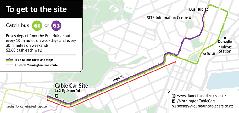 Buses come from the city to Mornington, as per the map below, and the central city Bus Hub at the southern end of Great King Street (opposite the Police Station and the Countdown car park) is a convenient starting point. Bus 61 leaves Hub stop C half-hourly on weekdays, and hourly weekends; Bus 63 departs Hub stop F every 15 minutes on weekdays, and half-hourly on the weekend.